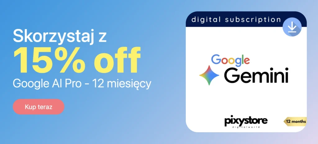 Dodatkowo, specjalnie dla klientów PixyStore mamy wyjątkową promocję. Używając kodu GEMINI15, otrzymasz aż 15% zniżki na produkt Google AI Pro | Gemini Pro | VEO 3. Oferta jest ważna tylko do końca sierpnia! Dzięki tej zniżce możesz zaoszczędzić aż 40 złotych!