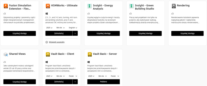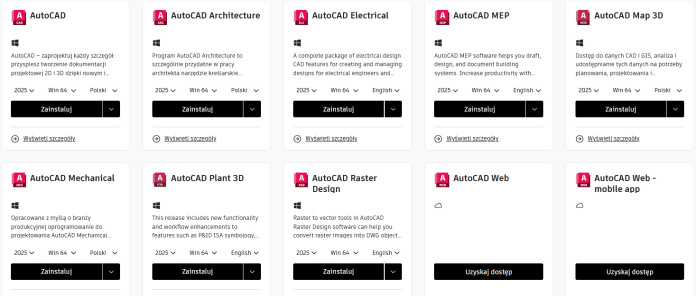 4. Pobierasz i instalujesz potrzebne narzędzia bezpośrednio z oficjalnej strony Autodesk (limit instalacji obejmuje zazwyczaj do 5 wybranych aplikacji na jednym zakupie).